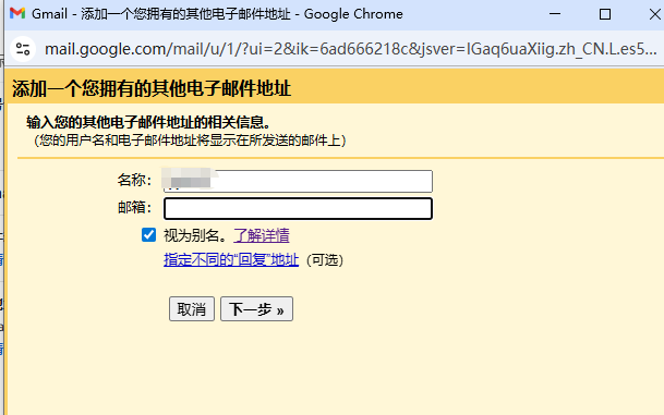 在 Gmail 设置(Settings > See all settings > Accounts and Import)中,点击 Add another email address。